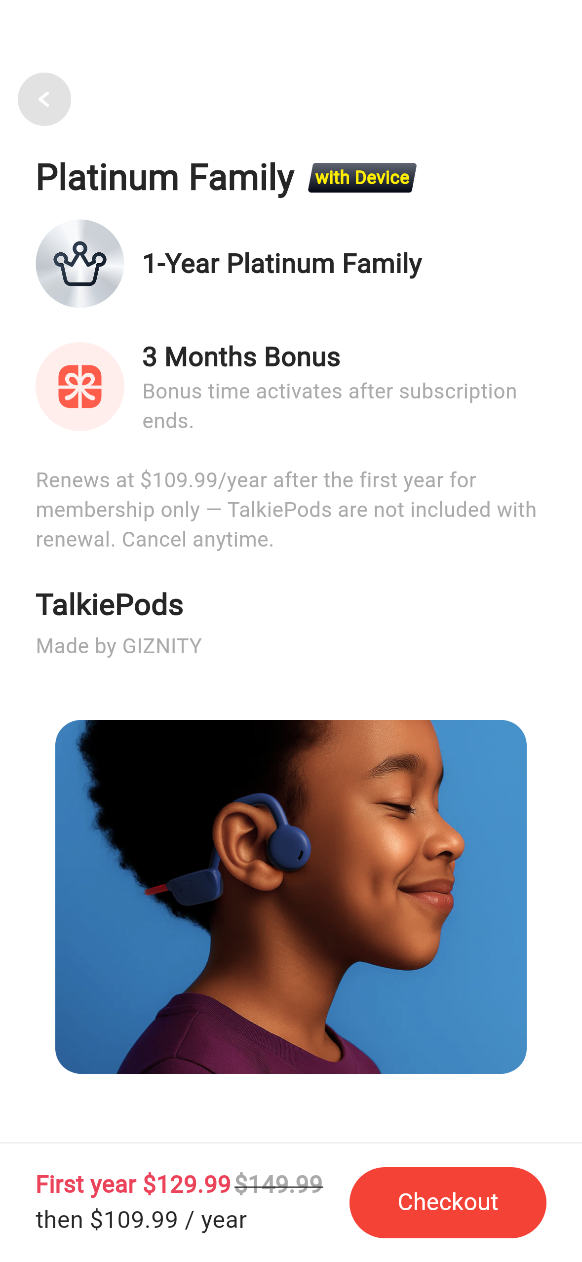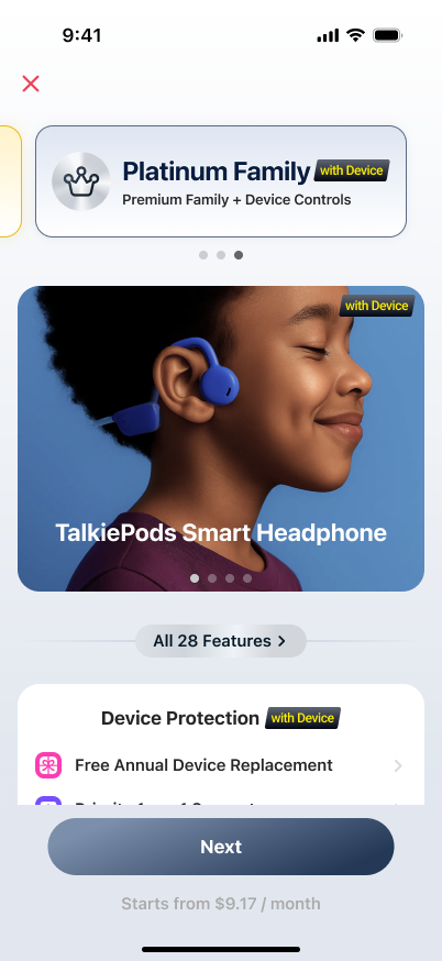 With Platinum Family, parents also gain exclusive control features for TalkiePods, such as safe volume settings, daily usage limits, battery monitoring, and usage reports.